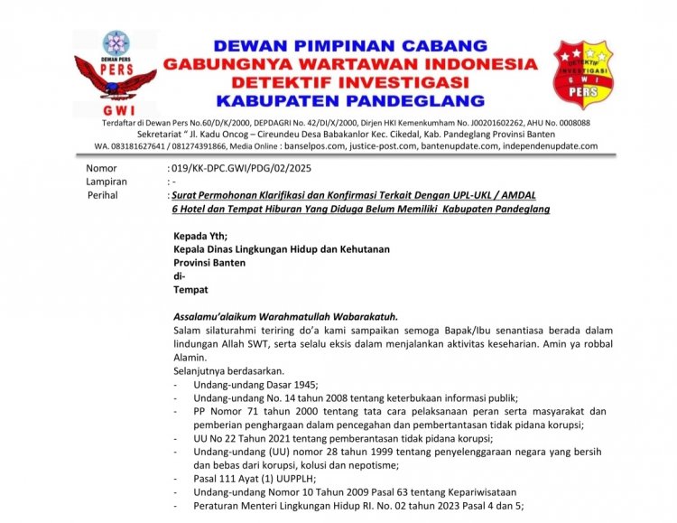 Raeynold Kurniawan, Ketua DPC GWI Pandeglang, menyampaikan kepada awak media "Kami dari DPC GWI Pandeglang sudah menyempaikan surat konfirmasi dan klarifikasi ke enam hotel tersebut tapi tidak ada jawaban, dan juga kami sudah langyangkan perihal permohonan data atau konfirmasi terkait UPL-UKL atau Amdal enam Hotel dan Tempat Rekreasi diatas ke Dinas Lingkungan Hidup dan Kehutanan Provinsi Banten, tapi sampai saat ini, Jumat (12/02/2025) tidak ada jawaban". Jelasnya.