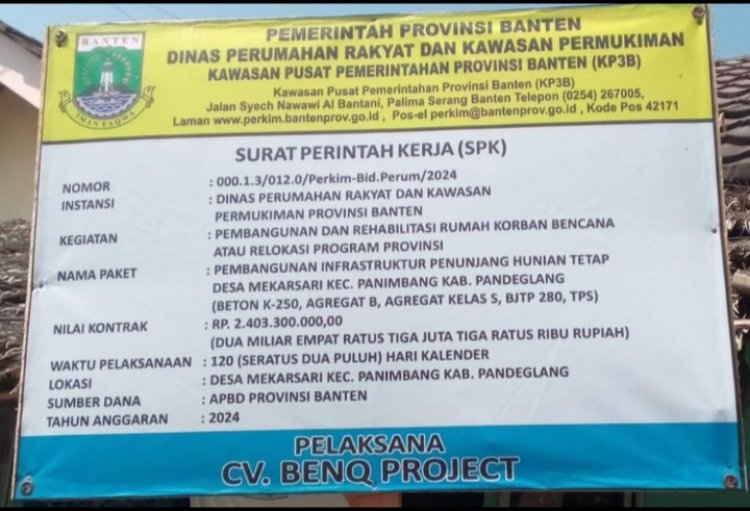 bantensuara.com, Pandeglang-Banten | Dengan adanya pekerjaan proyek pembangunan dan rehabilitasi rumah korban bencana atau relokasi program provinsi,Dengan titik lokasi di Kampung Huntap, Desa Mekar Sari Kecamatan Panimbang Kabupaten Pandeglang-Banten,Nomor:000.1.3/012.0/Perkim-Bid.Perum/2024.Dengan nilai kontrak Rp.2.403.300.000.00.- Sumber dana APBD Provinsi Banten yang dikerjakan oleh CV.BENQ PROJECT Diduga kuat ASJAD alias asal jadi dan disinyalir tak sesuai spek serta melalaikan APD dalam pelaksanaannya.