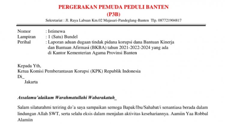 “Saya sudah membuat surat Laporan aduan dugaan tindak pidana korupsi dana bantuan kinerja dan bantuan afirmasi (BKBA) Tahun 2021,2022 dan 2024, yang ada di Kementerian Agama Provinsi Banten, ke Ketua Komisi Pemberantasan Korupsi (KPK) Republik Indonesia,” terangnya.