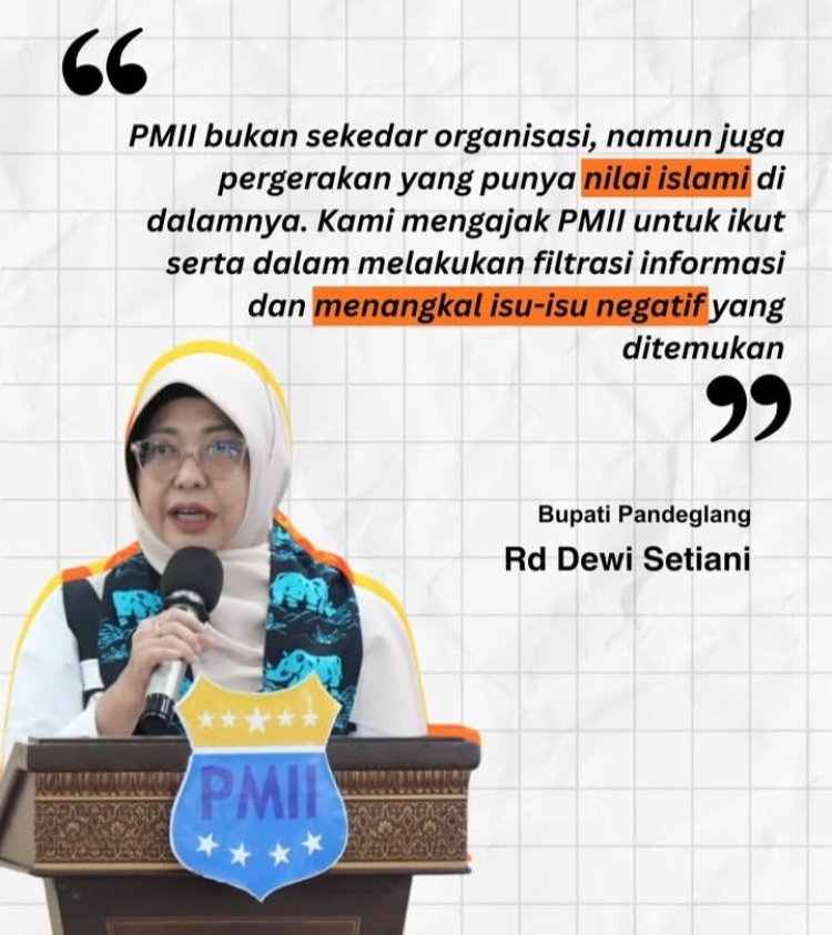 Dalam sambutannya, Bupati Pandeglang Raden Dewi Setiani menyampaikan bahwa PMII memiliki peran strategis sebagai mitra pemerintah daerah dalam meningkatkan kualitas sumber daya manusia, khususnya generasi muda di Kabupaten Pandeglang.