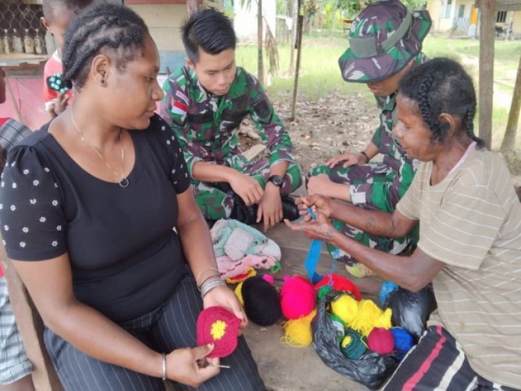 Kegiatan yang dipimpin oleh Serda Jhon Dedi disambut dengan gembira mama Sentani (50) pengerajin sulam souvenir khas Papua yang mendapat bantuan benang sulam dari anggota Satgas Yonif 143/TWEJ.